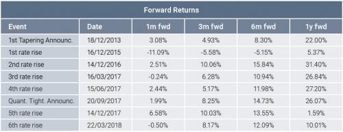 Under Janet Yellen as Fed chair, the tightening of financial conditions happened first through tapering in early January 2014. This was followed by action on the Federal Fund Rate (from 0% to 2,25% for a total of nine 25bps increases) starting in December 2015 and via the quantitative tightening that began in late 2017. This tightening cycle did not impact the stock market meaningfully, as the forward guidance was clear, and the interest rate trend was predictable. The table below shows various forward returns of the Nasdaq 100 starting at several key dates.