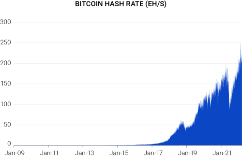 - Thirteen years after the first Bitcoin block was mined (January 2009) with a global hash rate of 5*10–11 EH/s, the world now counts over 1mn miners with a hash rate on a trajectory to reach ~325 EH/s by the end of this year.