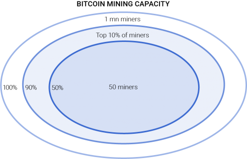 - NBER found that the top 10% of miners control 90% of the Bitcoin mining capacity, and just 0.005% (about 50 miners) control 50% of the mining capacity.
