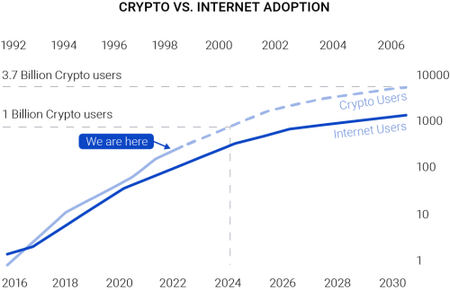 - The trend growth of crypto users of >100% per year is superior to the adoption rate of the internet in the early 90s (~65% per year).