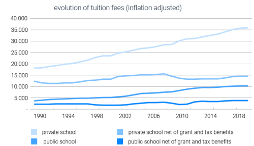 - Tuition fees at private institutions doubled between 1990 and 2018, on an inflation-adjusted basis.