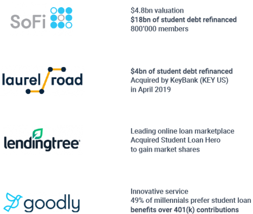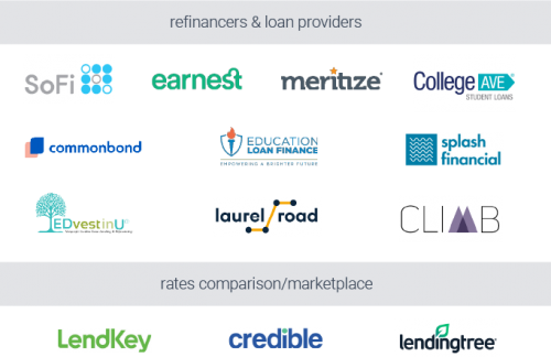 - Refinancers & Loan Providers: These companies propose to aggregate and refinance existing student loans. Refinancing is eventually executed in-house or through a traditional player. They aim at providing: