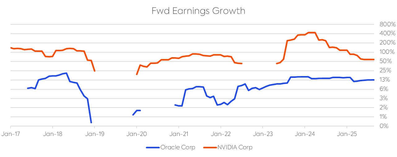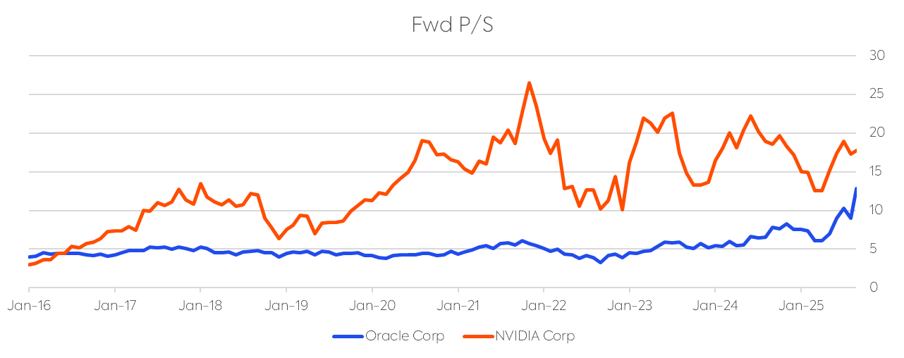On a stock level, Oracle appears extremely expensive relative to its history (top chart), with its exposure to OpenAI creating major concentration risk, especially in light of the recent rally. Nvidia, in contrast, looks relatively cheaper when factoring in EPS growth (bottom chart - missing data corresponds to negative values not showing on a logarithmic scale), though its fortunes are also tied closely to OpenAI’s spending trajectory.