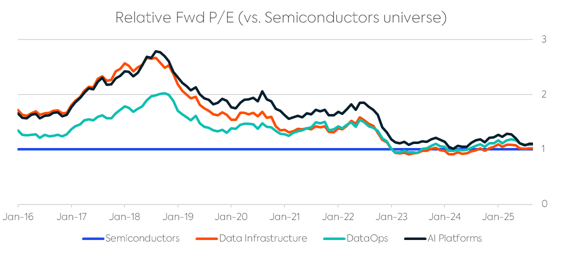 This enthusiasm is at the moment clearly visible in hardware, as Nvidia is the main benefactor of this spending spree along Broadcom (both in our portfolios). Forward P/Es in semiconductors have remained aligned with the software-oriented segments since the start of the “ChatGPT trade”, meaning semiconductors are at a historical valuation premium.
