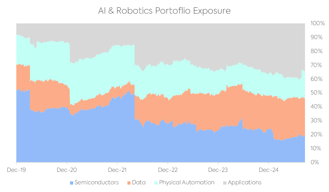 Our focus has always been on pure-players, which naturally creates a mid-cap bias: the weighted median market cap of our strategy is about $30bn, compared with ~$1.4tn for the Nasdaq 100. We hold no Magnificent 7 stocks except Nvidia,which has been in the portfolio since the strategy’s 2015 launch, and which is arguably the “purest” large-cap player. This also limits our involvement with the generalist chatbot players dominating headlines.
