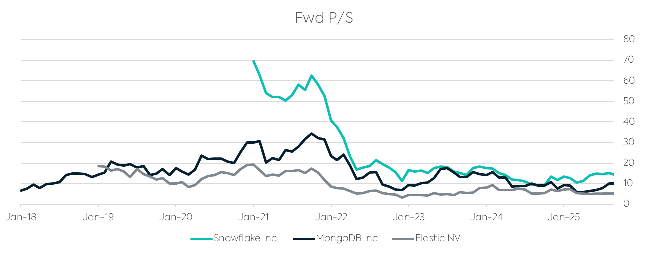 As a result, the portfolio is positioned in software companies still at the early stages of their acceleration curves, many of which delivered strong earnings despite AI representing only part of their growth (e.g., Mongodb), while valuations have normalized compared to historical averages.