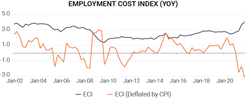 - Deflated by current inflation, ECI shows real employment cost decreased.