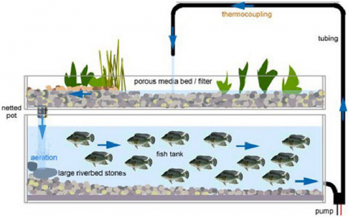 In a hydroponic system roots are submerged in an aqueous solution of macronutrients. In an aeroponic system plants are suspended in the air and nutrients transmitted through mist. Aquaponic solutions combine hydroponic techniques with aquaculture: in a closed-loop system, the water in which aquatic animals are raised is filtered and fed to the hydroponic system and then recycled back to the aquaculture.