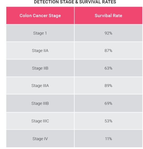 - Five-year survival rate for stage I colorectal cancer is around 92% vs. 11% for stage IV.