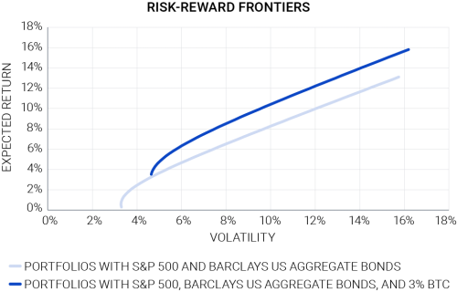 - Any investor with more than 25% exposure to equity can get higher returns for the same level of risks by including 3% of Bitcoin in the asset allocation.