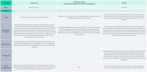 All over the world, drug manufacturers and researchers rush to develop a medical solution to the COVID-19 outbreak. Companies are currently exploring four approaches to fight against COVID-19: passive immunization, antivirals, anti-inflammatory drugs and active immunization (vaccines).