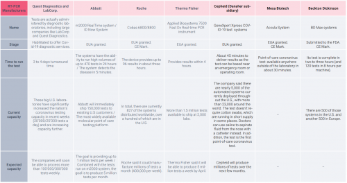 Abbott (ABT US); Abbvie (ABBV US); Abcellera (not listed); AIM Immunotech Inc (AIM US); Alnylam Pharmaceuticals (ALNY US); Altimmune (ALT US); Ascletis Pharma (1672 HK); Bayer (BAY GR); Becton Dickinson (BDX US); BGI Genomics (300676 CN); Biogen (BIIB US); Biomerica Inc (BMRA US); Biomerieux (BIOX FR); Biontech (BNTX US); Cansino Biologics (6185 HK); Chugai (4519 JP); Co-Diagnostics (CODX US); CTK Biotech (not listed); Curevac (not listed); Danaher (DHR US); Diasorin (DIAS IT); Distributed Bio (not listed); Dixon Corporation (not listed); Eli Lilly and Company (LLY US); EUROIMMUN (subsidiary of PerkinElemer Inc, PKI US); EveryWell (not listed); Eurofins Scientific (EUFI FR); Fujifilm (4901 JP); General Electric (GE US); GenMerk Diagnostics (not listed); Gilead Sciences Inc (GILD US); GlaxoSmithKline (GSK LN); Guangzhou Wondfo Biotech (300482 CN); Heat Biologics (HTBX US); Hologic (HOLX US); Illumina (ILMN US); Innovita Biological Technology (not listed); Inovio (INO US); Jiangsu Medomics Medical Technologies (not listed) ;Johnson & Johnson (JNJ US); Kogene Biotech (not listed); LabCorp (LH US); Lemonaid Health (not listed); Mammoth Biosciences (not listed); Medicago (not listed); Mesa Biotech (not listed); Moderna Therapeutics (MRNA US); No Borders (not listed); Novacyt (ALNOV FR); Pfizer (PFI US); PharmACT Holding AG (not listed); Philips (PHG NV); Quest Diagnostics (DGX US); Qiagen NV (QGEN US); Quidel Corp (QDEL US); Q2 Solutions (not listed); Regeneron (REGN US); Rising Pharmaceuticals (not listed); Roche (ROCG SW); Sanofi (SAN FP); Scanwell Health (not listed); Sherlock Biosciences (not listed); Shimadzu Corporation (7701 JP); Siemens (SIE GR); Snibe Diagnostic (not listed); Sona Nanotech (SONA CA); Sophia Holdings Co (6942 JP); Sugentech Inc (253840 KR); Takeda Pharmaceuticals (4502 JP); Thermo Fisher Scientific (TMO US); Tonix (TNXP US); Translate Bio (TBIO US); Vaxart Inc (VXRT US); Veredus Laboratories (not listed); VIR Biotechnology (VIR US); Wuxi Biologics Cayman (2269 HK); Xiamen AmonMed Biotechnology (not listed); Zhejiang Hisun Pharmaceutical (6002676 CN), Zheijiang Orient Gene Biotech (688298 CN)