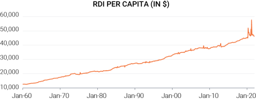 To compensate for the above-mentioned measure’s shortcomings, the alternative is to refer to the Real Disposable Income per Capita (RDI). Published by the U.S. Bureau of Economic Analysis, it includes every type of income, not only wages.