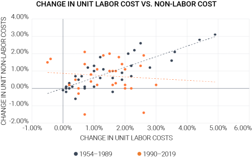 Before the ‘90s, changes in non-labor costs were followed by a change in labor costs, i.e., wages responded to price inflation, amplifying the price-wage spiral inflation. But since the ‘90s, this link appears to have essentially been broken, as wages are not increasing upon rises in non-labor costs.