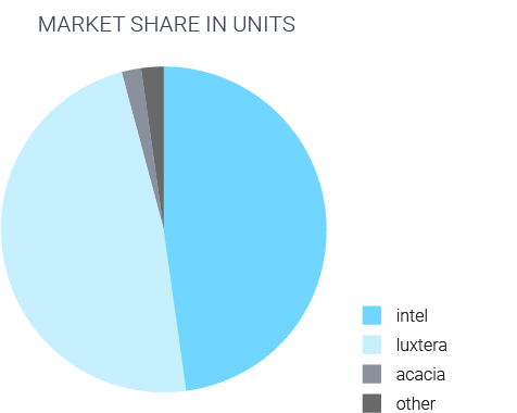 - The market is very concentrated: Intel, Luxtera (Cisco) and Acacia have a combined 98% market share.
