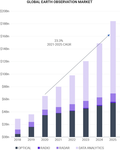 The global Earth Observation (EO) market is set to grow at 23% CAGR between 2021–2025. It relies on physical, chemical, and biological data obtained with ground-based techniques, e.g., thermometer, and progressively more on satellite data including advanced photo, radar, thermal, and sonar imagery.