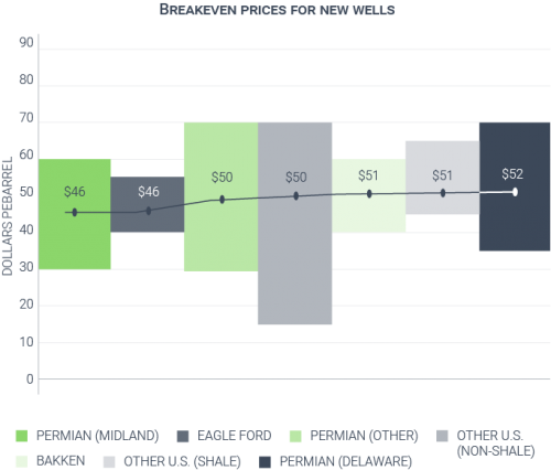 - WTI oil prices would have to rise back to ~$50/barrel to make new well drilling projects profitable in the U.S., while a price of ~$25 would be needed to at least cover operating expenses for existing wells.