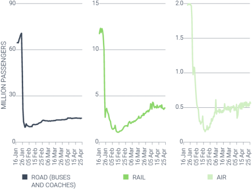 - China's highway traffic numbers were back to above 2019 levels by the end of March, while public transport usage remained well below normal.