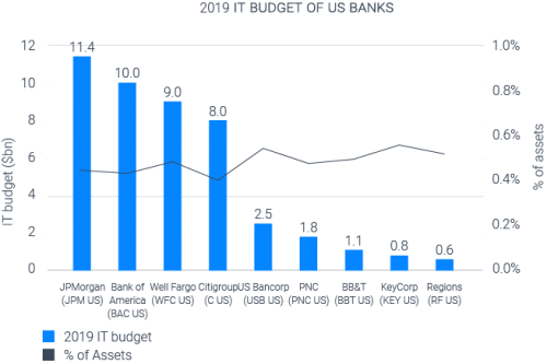 - According to UBS, the total IT budget (software, hardware, personnel, etc.) of U.S. banks is estimated at $67bn for 2019.