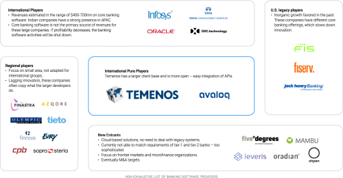 - Among the pure players, Temenos (TEMN SW) offers one of the most comprehensive product portfolios.